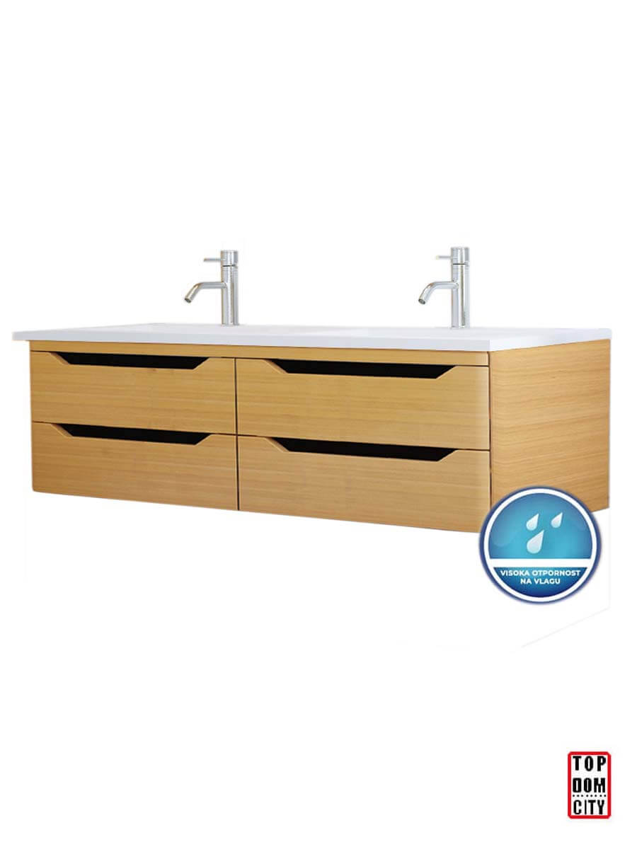Ormarić je izrađen od kvalitetnog pločastog MDF – medijapana debljine 19mm (front + bokovi) marke PFLEIDERER nemačkog proizvođača koji su presvučeni PVC folijom mat ili visokog sjaja 0,5mm od nemačkog proizvođača FINE DECOR. Prednost izrade ormarića od MDF ploča je duži vek trajanja i otpornost na vlagu. Ormarić sa fiokama ima integrisan mehanizam usporenog zatvaranja – soft close mehanizam. Okov je GTV gasne šarke – soft close, GTV gasni klizači-Soft close, GTV ručkice ALU (96,128,256, 320mm), TOYO. Dolazi u kompletu sa keramičkim umivaonikom sa otvorom za slavinu sa gornje strane.