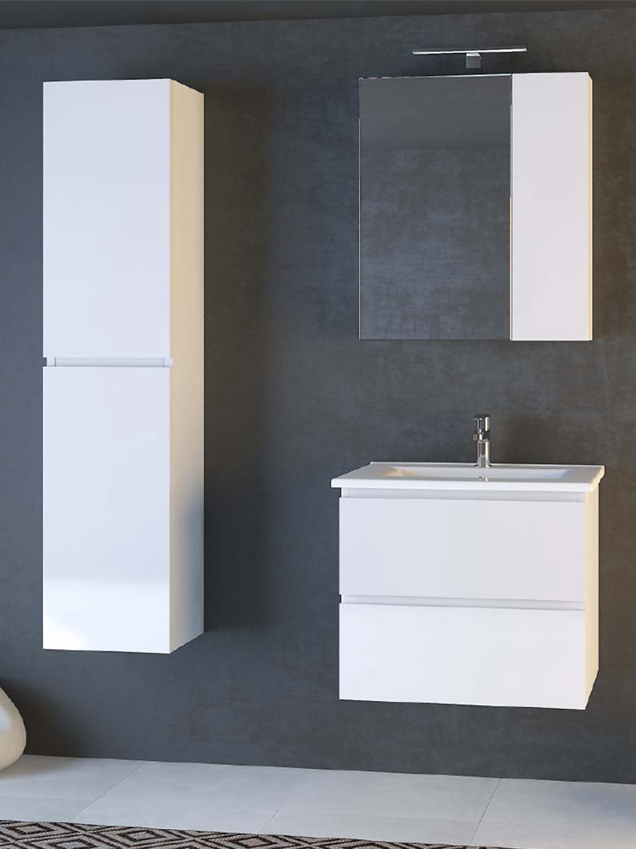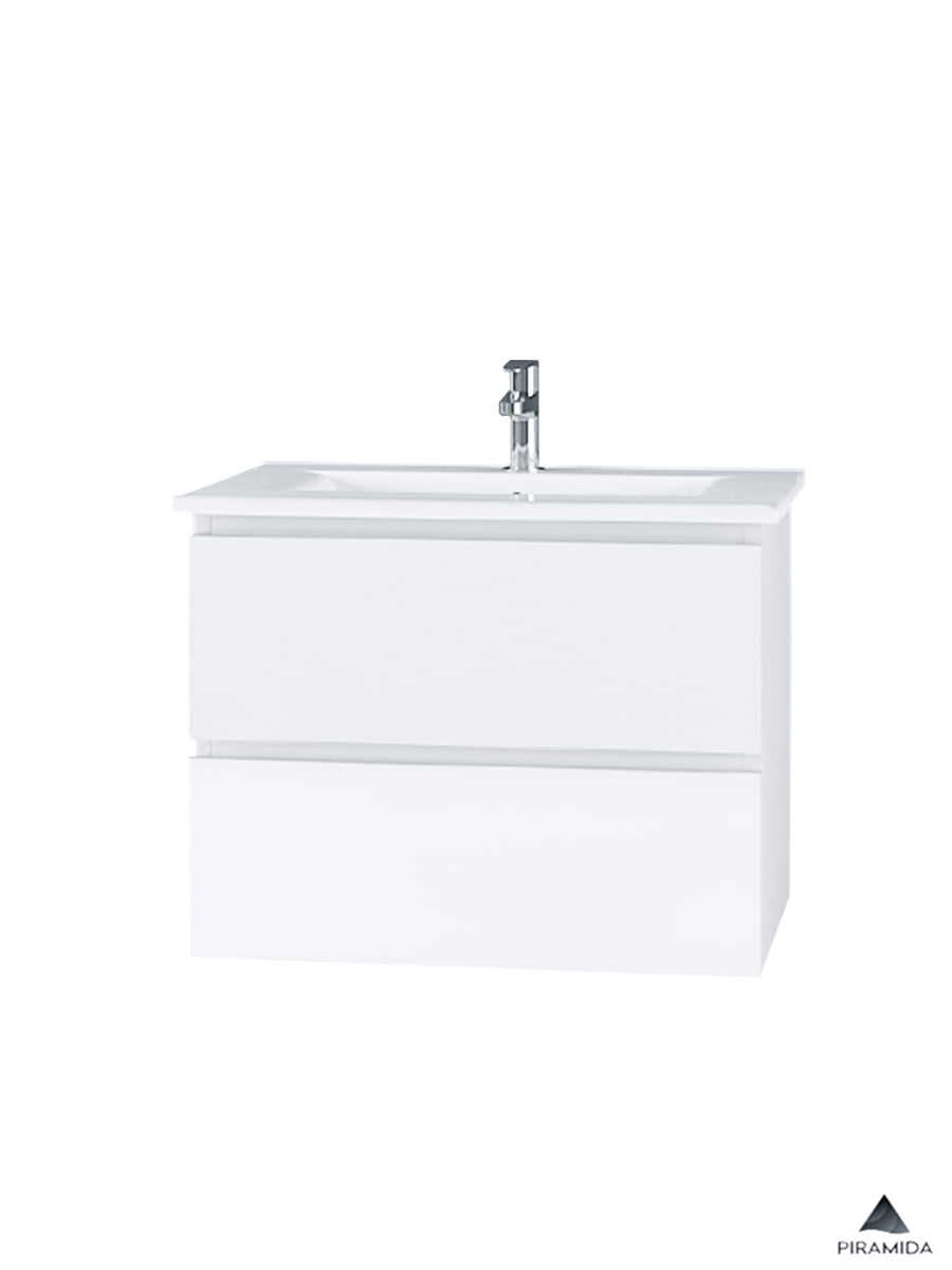 Viseći/konzolni ormarić sa dve fioke, front izrađen od kvalitetnog pločastog MDF materijala – medijapana, korpus od oplemenjene iverice. Fioke imaju integrisan usporeni mehanizam zatvaranja – soft close mehanizam. Zidni ormarić u beloj boji dolazi u kompletu sa belim keramičkim umivaonikom sa otvorom za slavinu.