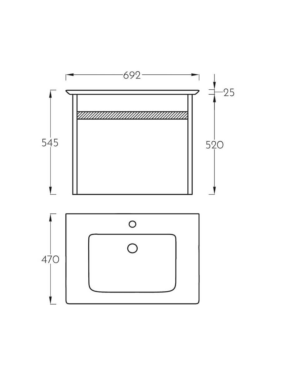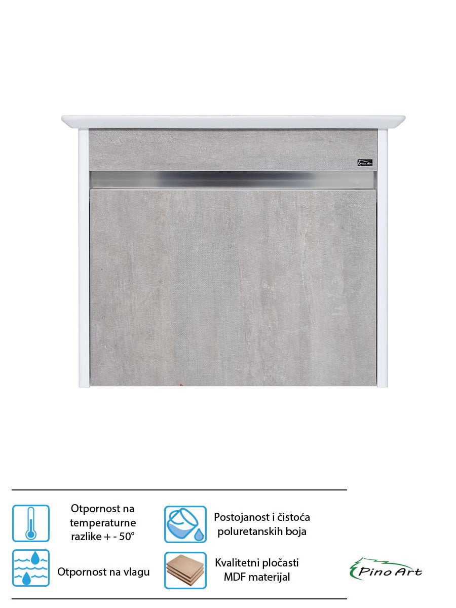 Lavabo sa ormarićem 69.2cm Pino Art-Sharp izrađen od kvalitetnog pločastog MDF materijala – medijapana iznutra i spolja, front u beton dezenu, korpus (bočni deo) lakiran u belo visoki sjaj. Bojen poliuretanskim lakom koji pruža postojanost boje i visoki sjaj, otpornost na vlagu i temperaturne razlike +-50 stepeni. Keramički umivaonik sa otvorom za slavinu sa gornje strane. Ručke na ormariću aluminijum sjaj.