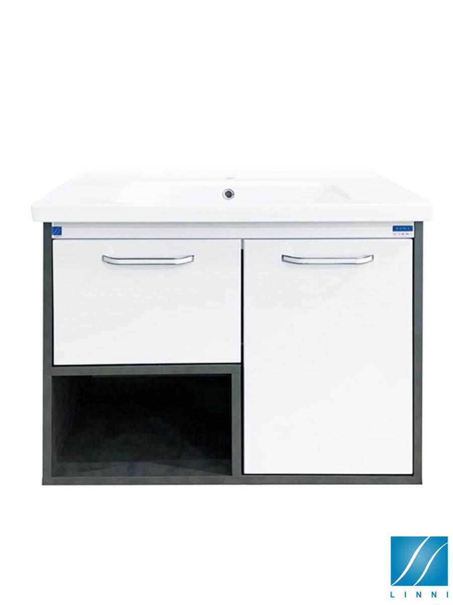 Lavabo sa ormarićem 80cm Linni Roma izrađen od kvalitetnih ploča medijapan – MDF materijala. Front ormarića u belom dezenu, korpus (bočni deo) u sivoj boji. Prednost izrade od MDF ploča je visoka otpornost ormarića na vlagu i dugoročniji vek trajanja. Ugrađen mehanizam usporenog zatvaranja – soft close mehanizam. Dolazi u kompletu sa belim keramičkim umivaonikom sa otvorom za slavinu. Ormarić za kupatilo sa nadgradnim lavaboom najbolji je način da iskoristite prostor u vašem kupatilu. Upečatljivog dezena i svedene forme uneće u vaš kupatilski prostor dodatnu notu elegancije. Ormarić sa umivaonikom brenda Linni je idealan spoj cene i kvaliteta. Svojim dizajnom pruža neverovatnu mogućnost kombinovanja sa ostalim kupatilskim elementima.