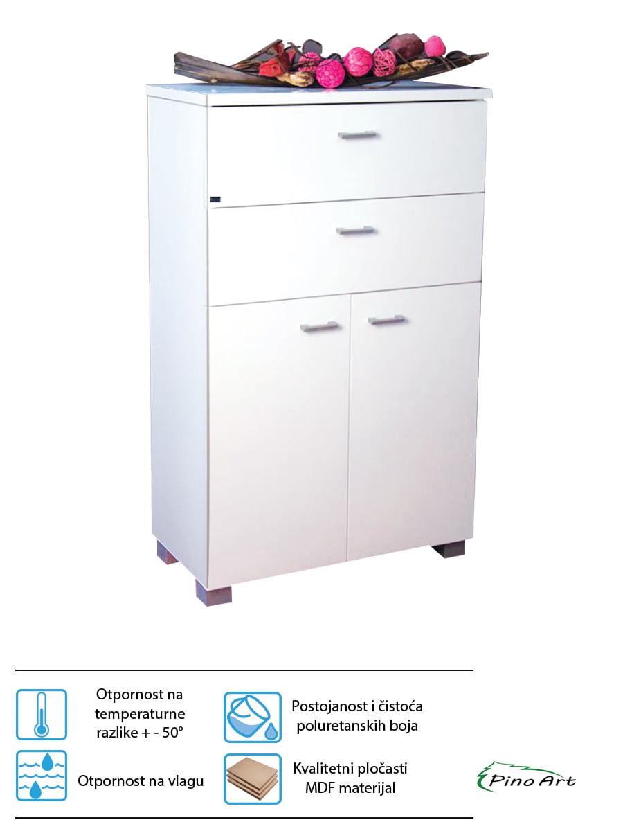 Ormarić 68×109.5cm Pino Art Klasik izrađen najmodernijom tehnologijom u sferi izrade kupatilskog nameštaja. Front ormarića izrađen od kvalitetnog pločastog MDF materijala, bočni deo od oplemenjene iverice. Ormarić lakiran u beli visoki sjaj sa metalnim mat ručkama i PVC mat nogari. Bojen poliuretanom koji pruža zaštitu od vlage i postojanost boje.