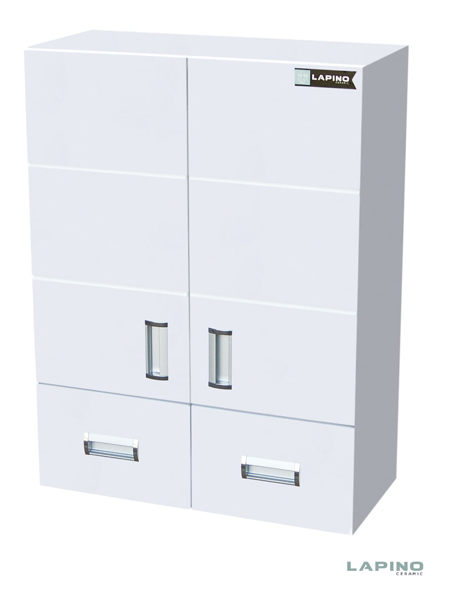Ormarić 60x80cm Lapino Sudo Roma izrađen od kvalitetnog pločastog MDF materijala i oplemenjene iverice. Bojen poliuretanskim lakom koji pruža postojanost boje i visoki sjaj, otpornost na vlagu i temperaturne razlike +-50 stepeni. Sa dvoje vrata, policama i dve fioke.