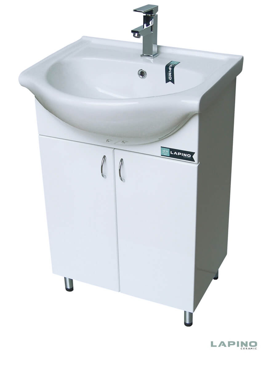 Ormarić sa umivaonikom Lapino 55cm – 5815 idealan je izbor za uređenje vašeg kupatila. Podni/stojeći ormarić za kupatilo bele boje sa dvoja vrata od medijapana i iverice bojen poliuretanom ima savršen površinski sjaj, postojanost boje i otpornost na vlagu. Dolazi u kompletu sa belim keramičkim umivaonikom sa otvorom za slavinu.